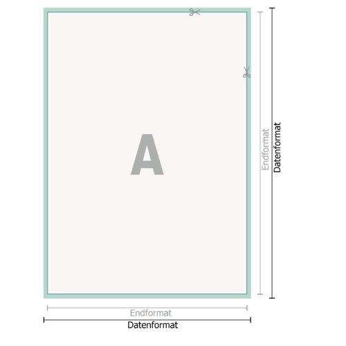 - Achtung: Ausgehend vom angegebenen Format muss umlaufend ein 2 mm Beschnitt angelegt werden, wichtige Informationen mit mind. 4 mm Abstand zum Endformat