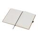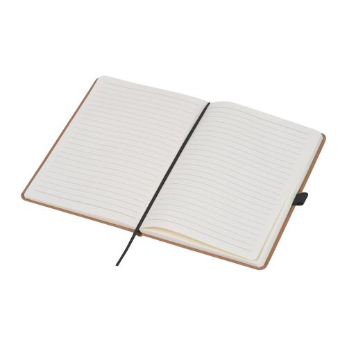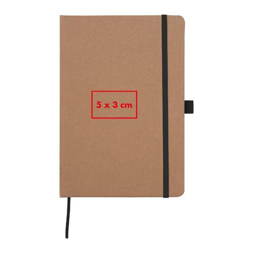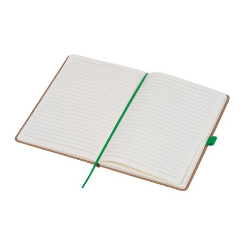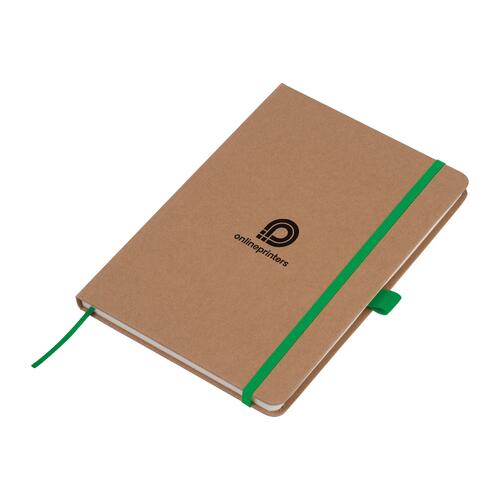 • A5 Notizbuch aus recyceltem Papier mit 160 linierten Seiten, einem Lesezeichen sowie einer Kugelschreiberschlaufe die farblich auf das Verschlussband abgestimmt ist