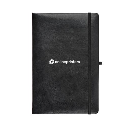 Schwarzes Notizbuch mit Hardcover und Lesezeichen.