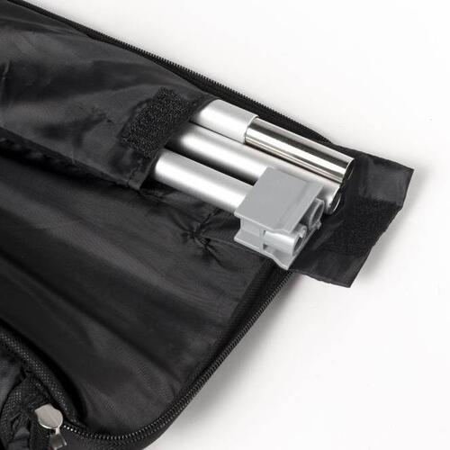 - Rollup Standard-System aus Aluminium, mit bedrucktem Banner, 3-teiliger „Zeltstange“ und komfortabler Tragetasche