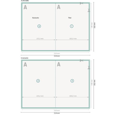 - bitte senden Sie keine Einzelseiten, sondern eine zusammenmontierte Außenseite und eine zusammenmontierte Innenseite - d.h. insgesamt zwei druckfertige Seiten - siehe Datenblatt
