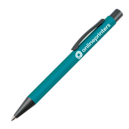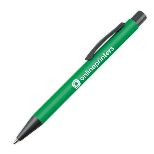 - Druckkugelschreiber mit blau schreibender Mine, matt farbigem Schaft und Clip aus Metall