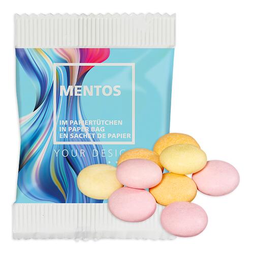 - Zutaten mentos® Fruchtmix: Zucker, Glukosesirup, Fruchtsaft (2,0%) (Erdbeere, Orange, Zitrone), Kokosöl (ganz gehärtet), Säuerungsmittel (Citronensäure), Stärke, Kakaobutter, Aromen, Maltodextrin, Verdickungsmittel (Gellan, Cellulosegummi, Gummi arabicum), Emulgator (Zuckerester von Speisefettsäuren), Überzugsmittel (Carnaubawachs), Farbstoffe (Beta-Carotin, Beetenrot)
