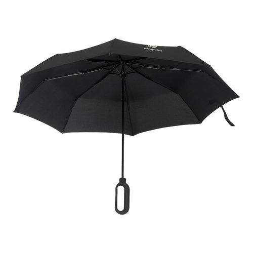 Schwarzer Regenschirm mit Griff und Öffnungsmechanismus.
