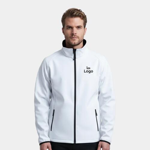 Weiße Softshelljacke aus Polyester für Herren mit Reißverschluss.