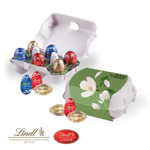 - 6 Stück (ca. 30 g) Schokoladen-Eier von Lindt, mit Karton-Einleger im „Ostergras-Design“.