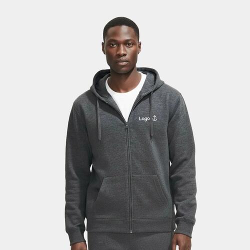 Graue Sweatjacke mit Kapuze und durchgehendem Reißverschluss für Herren.