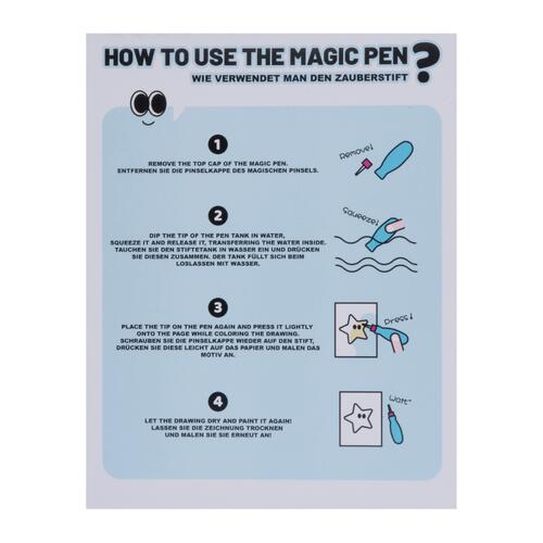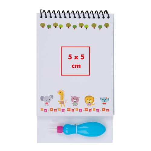 • Einfach Wasser in den Pinsel einfüllen und auf einer der vier Seiten mit den lustigen Tiermotiven losmalen